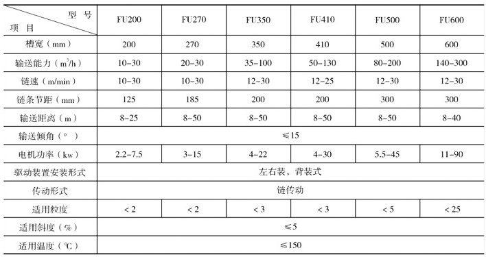 ·FU系列刮板輸送機廣泛運用于堆積密度<l.6t/m3,磨琢性較強,粉、粒、小塊狀物料的水平、小傾角(≤50)連續輸送,如煤粉、碎煤、水泥、粉煤灰、焦粉、焦粒、礦粉、化肥、糧食等大輸送量(≤600t/h)、長距離(<60m)、較高溫度(<150℃)物料的連續輸送。
